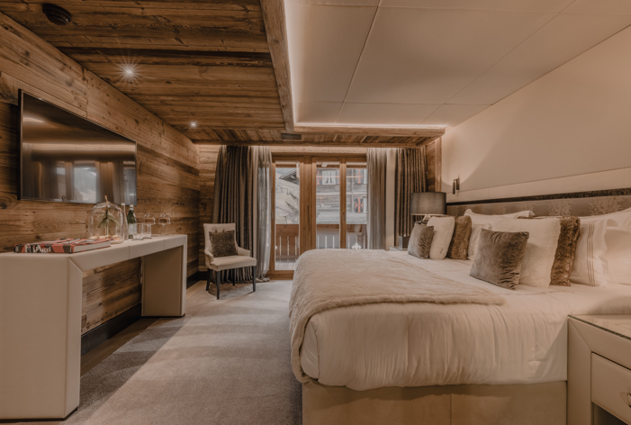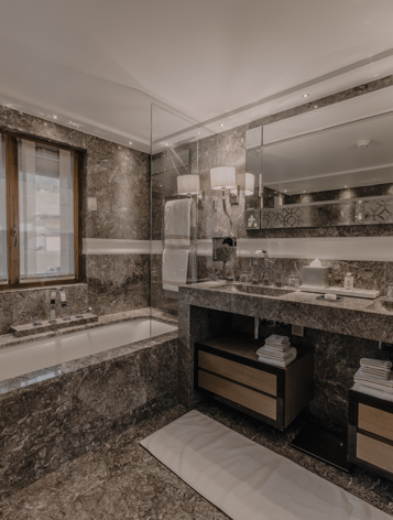 The design of the large lounge in our Family Suite allows you to create the atmosphere of a private chalet with all the benefits of the hotel. There are king-size beds, a walk-in wardrobe and one spacious bathroom with a shower and bathtub.